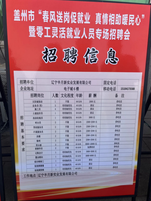 为拓宽盖州市广大妇女及家庭成员就业增收渠道,助力全市经济社会高质量发展,3月13日,市妇联积极参与由市委组织部、市总工会、市人力资源和社会保障局、市工商联联合主办,团市委、市妇联、市商务局、市工信局、市文旅局、市农业农村局、市退役军人事务局、市残联、市融媒体中心协办,市就业和社会保障事务中心承办“春风送岗促就业,精准服务暖人心”专场招聘活动。