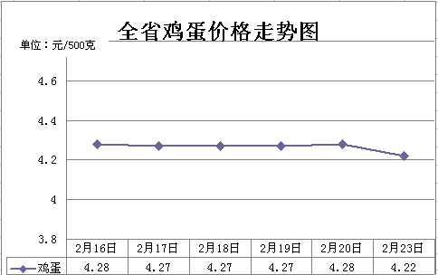 二、鸡蛋价格小幅下降。节前商家加大了备货力度,节日开始后需要去库存,叠加春节期间部分食堂放假休息,集采有所下降,整体市场需求不旺,推动了鸡蛋价格小幅下降。2月23日,鸡蛋平均价格4.22元,周环比下降1.4%,同比上涨3.69%。