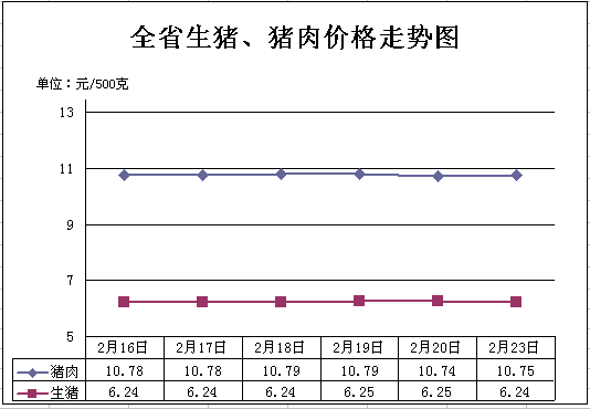 一、猪肉价格微幅下降。受节日餐饮菜品需求提升影响,居民消费时多会选择平时较少吃的特色或较贵的菜肴,替代猪肉的菜品较多,海鲜和牛、羊肉多为首选,叠加部分养殖企业在节日期间选择加大供应,猪肉价格出现微幅下跌。2月23日,生猪(每500克,下同)平均价格6.24元,周环比持平,同比下降18.86%;猪肉(去骨后腿肉)10.75元,周环比下降0.28%,同比下降13.52%。
