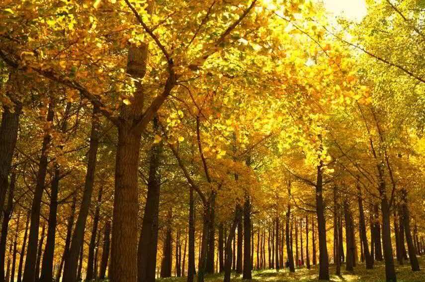 当秋意渐浓,满山的银杏树的叶子渐渐变黄,漫步在银杏林间,脚下是厚厚的金色落叶,踩上去沙沙作响,仿佛在演奏一曲秋日的乐章。阳光透过树叶的缝隙洒下来,形成一道道金色的光束,为这片银杏林增添了一份神秘与浪漫。