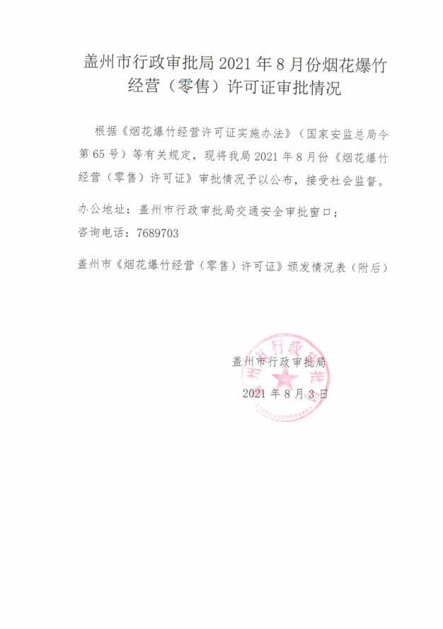 | 4 | 盖州市青石岭镇太平烟花爆竹批发部 | 盖州市青石岭镇青石岭村 | 徐奎 | 13941787518 | 个人燃放类C、D级烟花爆竹成品 | 零售(最大存放总药量70公斤) | GSPYHLS[2021]016 | 2021.8.3-2022.8.2 |