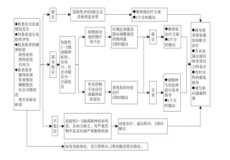 3.病情稳定患者。若危险性为 0 级, 且精神症状基本消失, 自知力基本恢复, 社会功能处于一般或良好,无严重药物不良反应,躯体疾病稳定,无其他异常, 继续执行上级医院制定的治疗方案, 3 个月时随访。