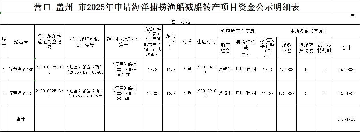 根据《营口市渔业安全专项整治年工作方案》(营政办〔2025〕27号)、《营口市海洋捕捞渔船“减船转产”及“木改钢”奖补工作实施意见》(营海渔〔2025〕98号)文件精神,经会同沿海镇(街)、村、营口市海洋与渔业行政执法队船检科,对申报的减船转产船只的资料及船只进行现场审核。经审核有2艘申请要件真实有效,符合渔船减船转产条件,同意渔船进行减船转产。