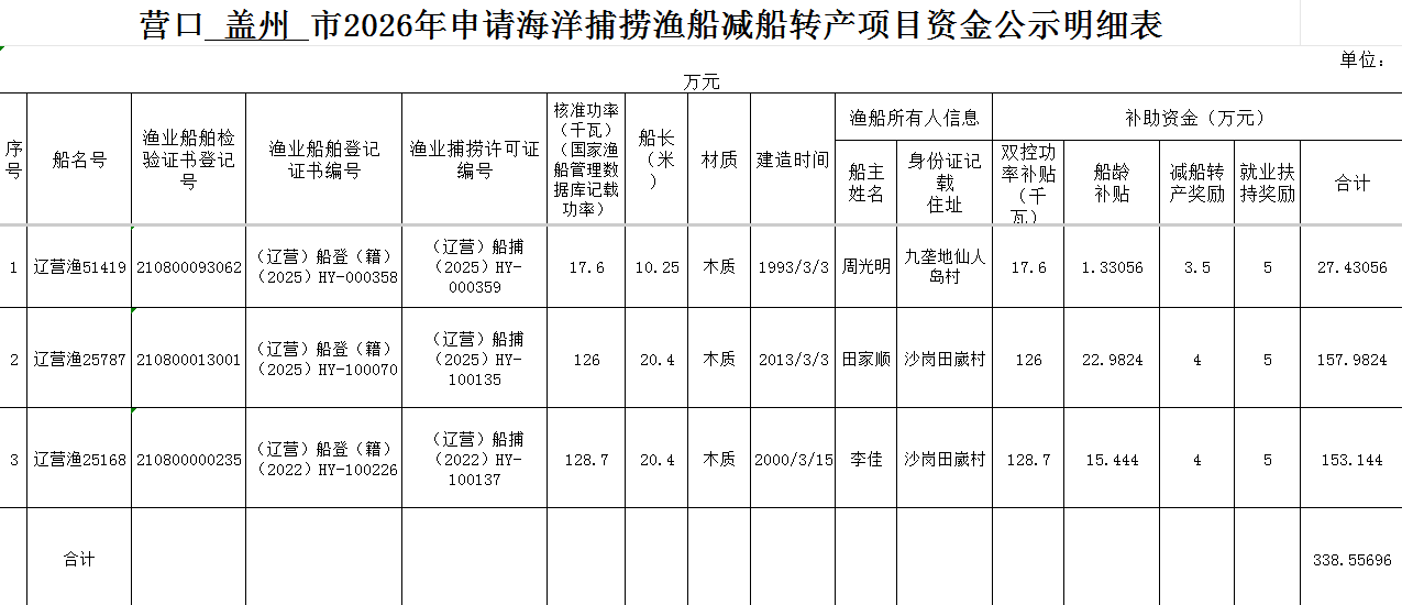 现根据有关规定,对申报减船转产渔船进行公示,公示期为3个工作日,从2026年3月26日至2026年3月28日,对申请减船转产渔船是否存在,船舶证件是否齐全有效,船证是否相符等问题存在异议者,可以口头或书面形式向盖州市农业农村局进行反馈,逾期不予受理。
