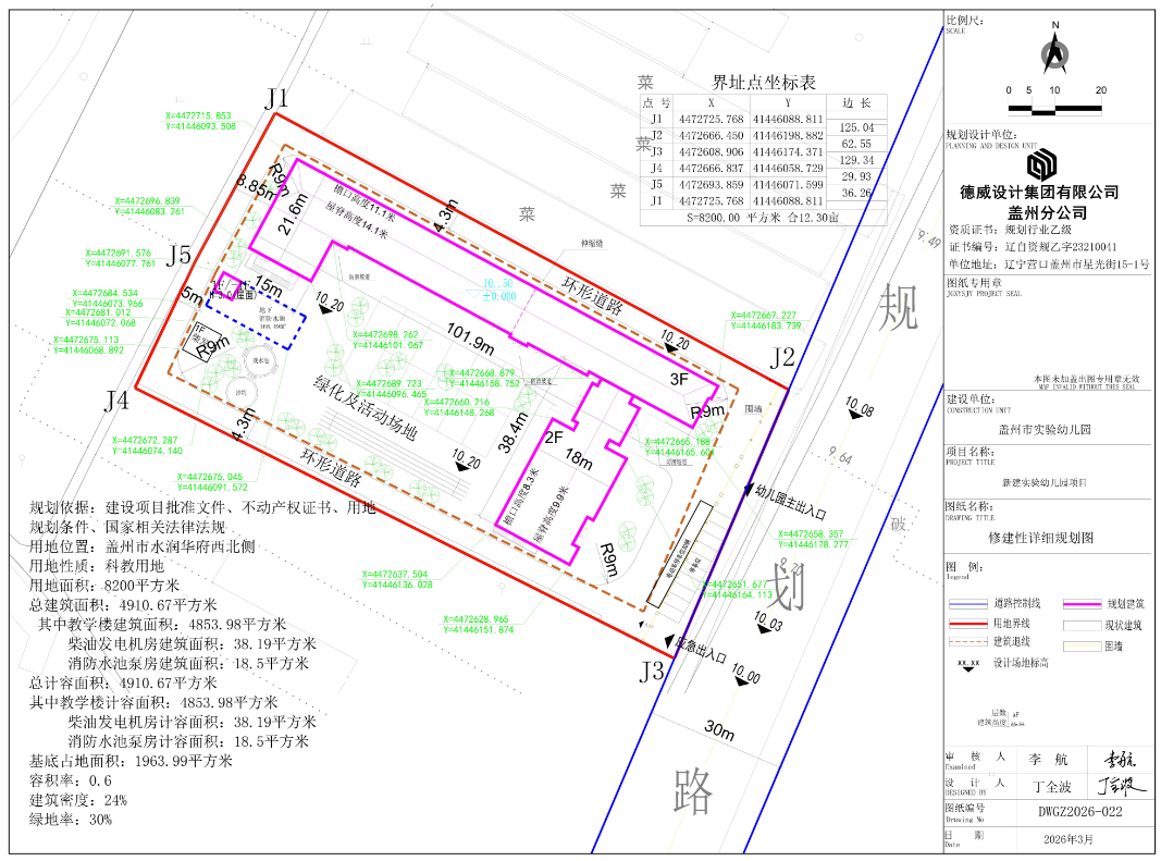 盖州市新建实验幼儿园项目,规划用地性质为教育用地,项目用地面积为8200平方米。现建设单位已委托设计单位按照相关技术标准和规范优化完善了建设工程规划设计方案,现将规划设计方案予以公示并公开征求相关厉害关系人意见。
