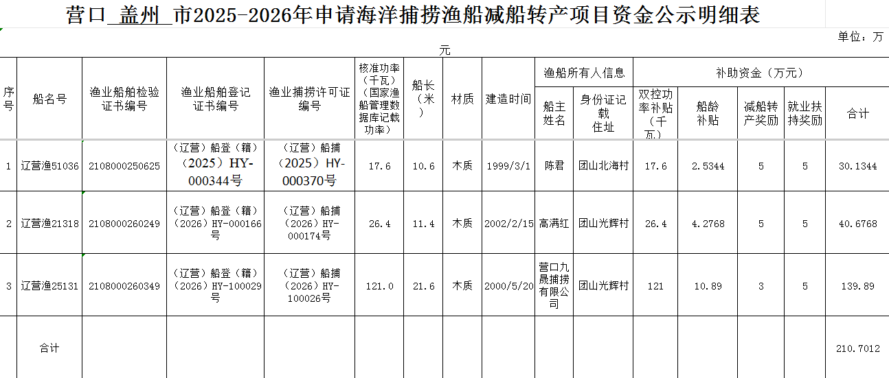 根据《营口市渔业安全专项整治年工作方案》(营政办〔2025〕27号)、《营口市海洋捕捞渔船“减船转产”及“木改钢”奖补工作实施意见》(营海渔〔2025〕98号)文件精神,经会同沿海镇(街)、村、营口市海洋与渔业行政执法队船检科,对申报的减船转产船只的资料及船只进行现场审核。经审核有3艘申请要件真实有效,符合渔船减船转产条件,同意渔船进行减船转产。