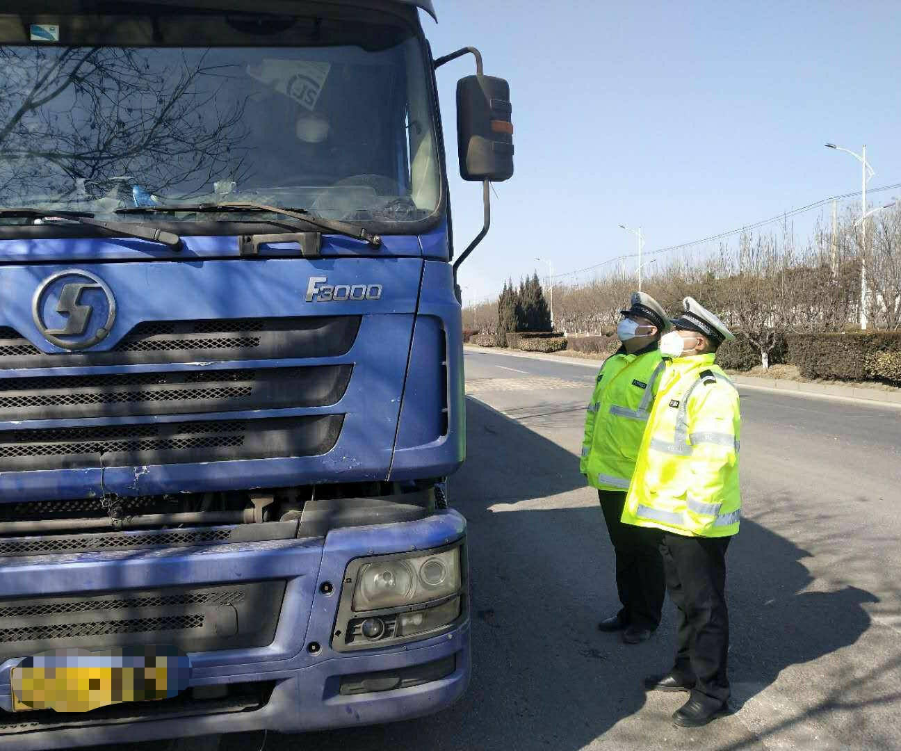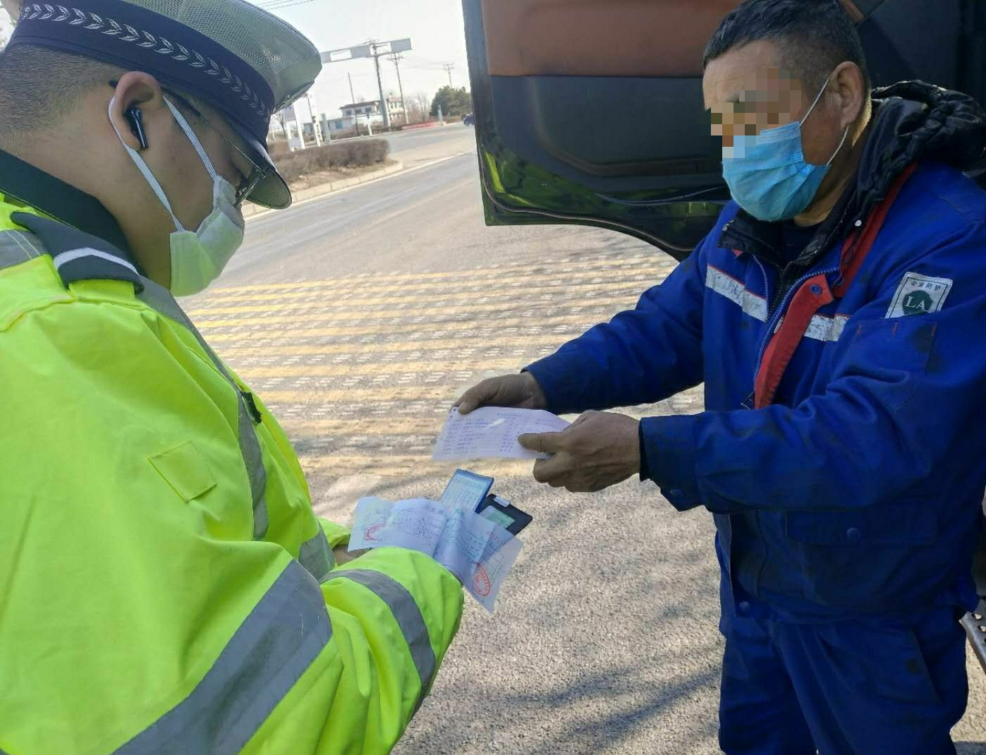在打击“百吨王”超限超载货车工作中,执勤民警、辅警坚持做好自身防护工作,佩戴防护口罩、手套等,有效杜绝和减少病毒感染的风险。