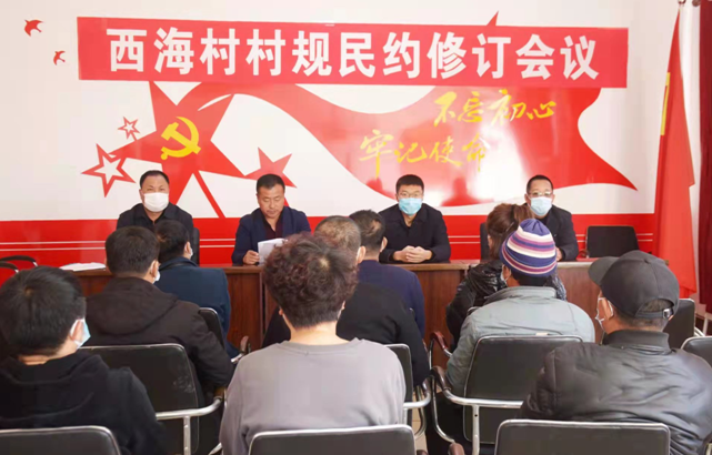 近期,西海街道西海村作为村规民约修订试点,组织召开专题修订会议,主要从社会治安、消防安全、村风民俗、邻里关系、婚姻家庭五个层面,开展《西海村村规民约》修订工作。着力推进村民主法治建设及美丽乡村建设,维护社会稳定,促进经济发展,树立文明向善的村风民风,创造安居乐业的社会环境。