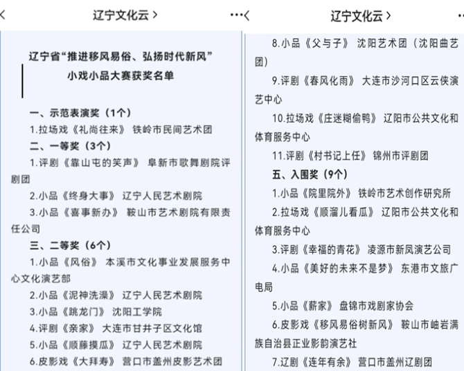由辽宁省精神文明办、省公共文化服务中心联合主办,省文化艺术研究院承办的辽宁省“推进移风易俗、弘扬时代新风”小戏小品大赛活动,于2022年6月至2022年11月举行,活动收到来自全省各县市区的参赛作品共74件,经过初评、复评、终评,评出各类奖项30个,我市网上申报两部剧目均已荣获奖项,国家级非遗盖州皮影戏《大拜寿》获得二等奖,辽剧《连年有余》获得入围奖。