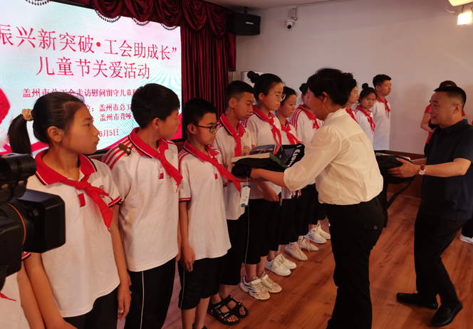 活动中,市总工会、市教育局领导走访慰问了来自盖州市育智学校、盖州市聋哑学校、盖州市高屯学校的新就业形态劳动者家庭子女、困难职工子女和留守儿童共计100余名,为孩子们送去书包、学习文具等慰问物资,嘱咐他们好好学习,早日成长为祖国栋梁,并向全社会发出关怀留守儿童的倡议,希望孩子们得到更多的关注,收到更多的善意和关怀。