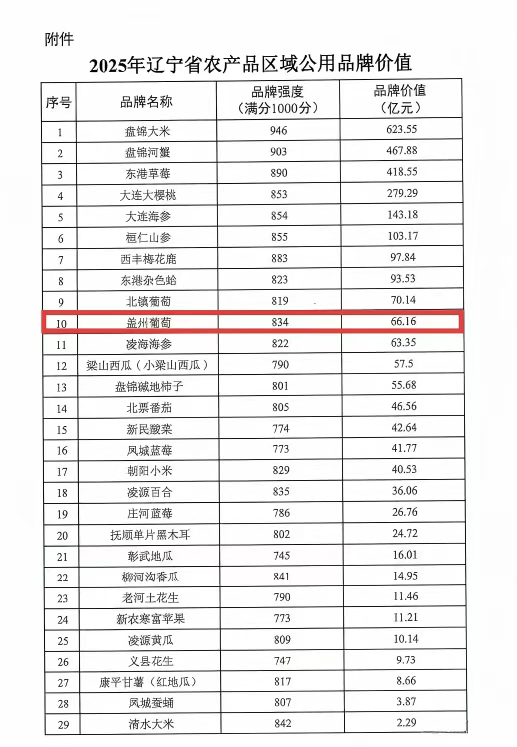为贯彻落实质量强省、品牌强省战略,推动辽宁特色农产品品牌化发展,近日,辽宁省农业农村厅、辽宁省市场监督管理局联合发布2025年辽宁省农产品区域公用品牌价值测算结果,29个优质农产品品牌榜上有名。其中,盖州葡萄以834分的品牌强度、66.16亿元的品牌价值位列榜单第10位,成为辽宁果品类品牌的亮眼代表。